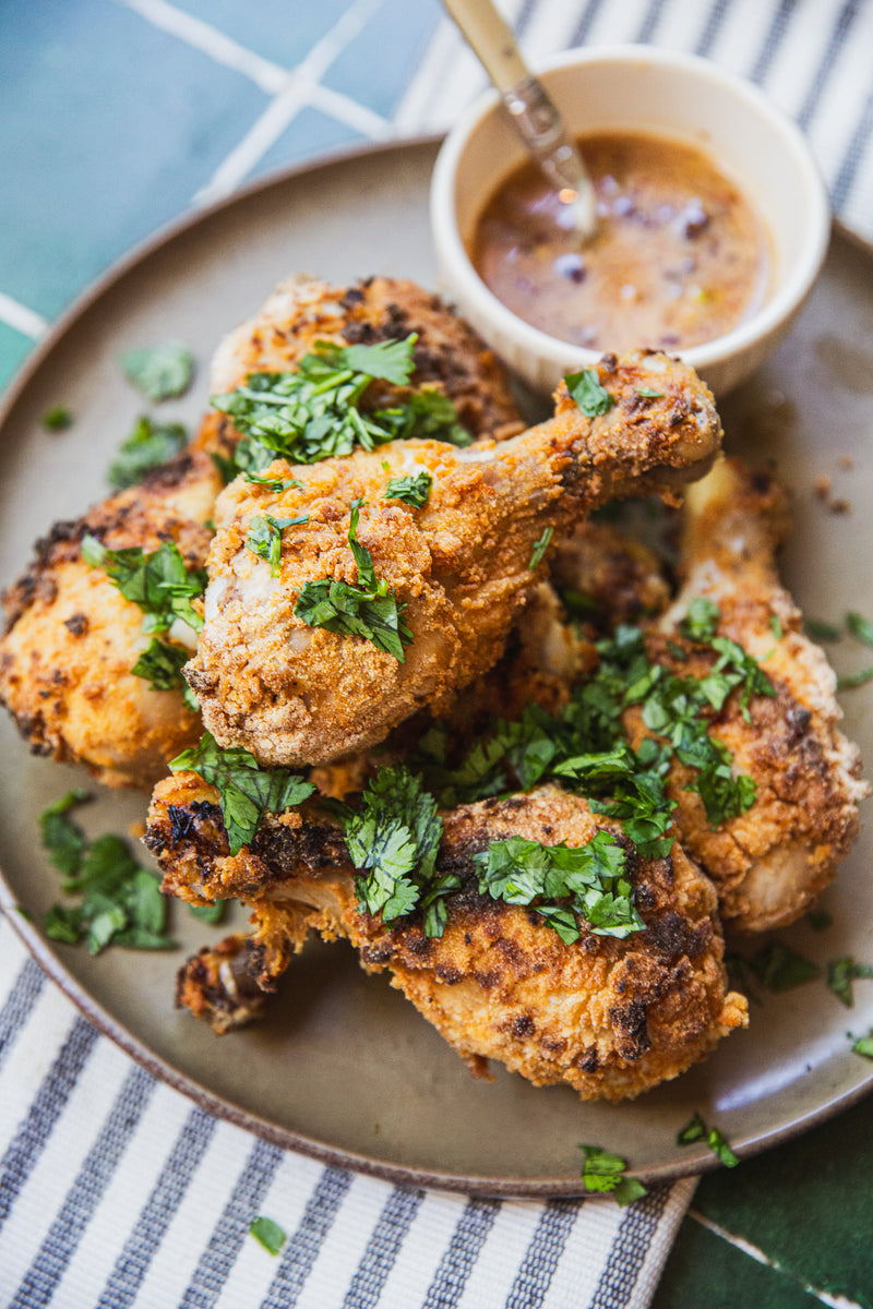 Mustard Chicken Drumsticks with Macha Agave Sauce